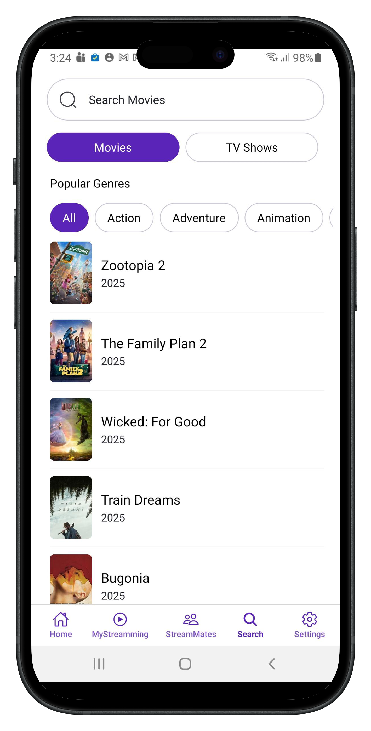 Choose your favourite genres like Drama, Romance, Sci-Fi, Thriller, Action, and more. StreamMates tailors your experience around what you enjoy most.