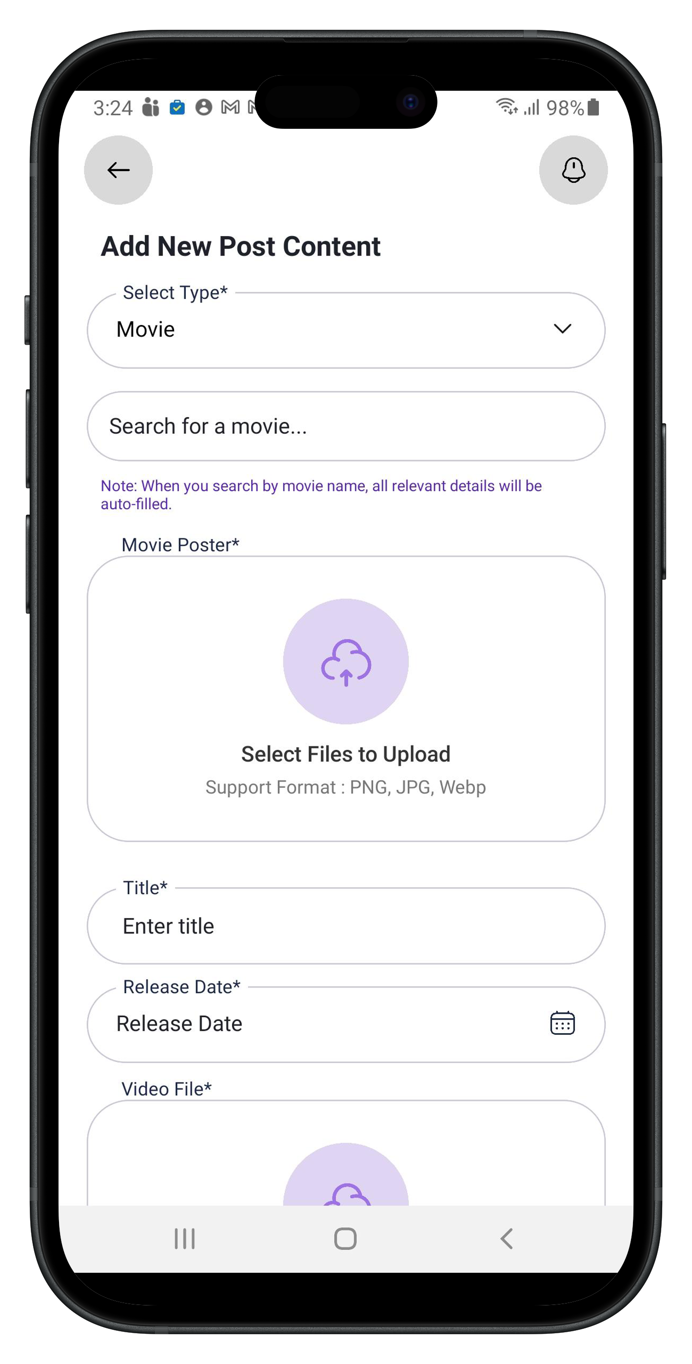 Creators and contributors can upload new movie/show banners with full details, cast, description, and media.
